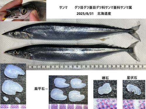北海道産のサンマ、2尾336円を買う。 出始めに比べたら値段は下がってきたが、身体はかなり華奢。 口も小さくて、おちょぼ口。 塩焼きにしたのだが、全然ジュージューしない。本格的なサンマの季節はまだまだ先のようだ。 サンマの耳石です。サンマの耳石は…
