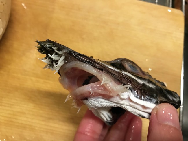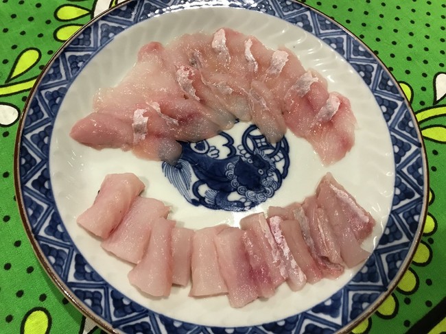 2021-10-24 ハッカク ハッカク 北海道産のハッカク、680円を買う。 鰭がゴージャス!黒いドレスを着てるみたい。 竜っぽい顔。 口はずいぶん下の方にある。 出汁を取るために霜降りにしたら皮が縮んで、口周りの構造とヒゲが分かりやすくなった。 お刺身にする。 半身は中骨入りのまま薄造り、もう半身は中骨を切り取ってぶつ切りに。 どちらも美味しいけど、個人的にはぶつ切りの方が歯応えと、ぎゅっと噛んだ時に脂がじゅわっと出る感じが好きだ。 出汁でシチューを作る。 耳石は肉厚ででこぼこしてる。