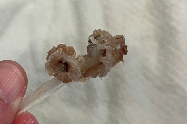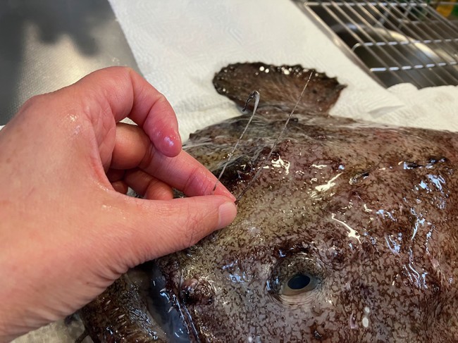 アンコウの脳みそはちょっと変わっている。これまでに耳石を採取した魚の脳みそは、ぷるんとした白子のようだったが、アンコウの脳みそは透明な粘液の中に粒粒がたくさん散らばっている感じ。そして頭蓋骨は半透明の軟骨。