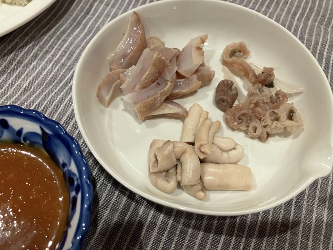 まずは内臓。胃、腸?、心臓、エラを茹でた。酢味噌で食べる。
