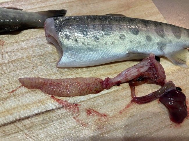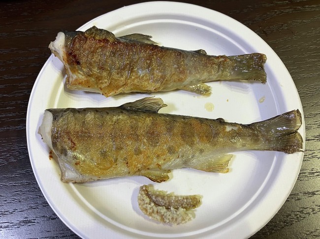 ヤマメには卵も入っていたので一緒に焼いて食べた。一口分しかなかったが、周りはカリカリ、中はむっちりしてて美味しかった。
