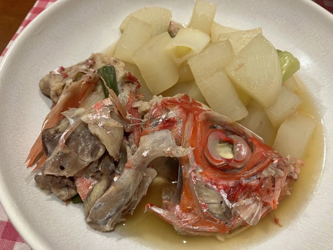アラは湯通しして掃除をしてから大根とネギと煮る。お腹がほっこり温まる。