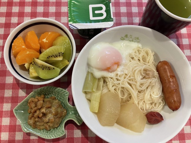 翌朝、残った煮汁に茹でた素麺を入れて味を含ませる。焼き鯖素麺ならぬ煮金目鯛素麺。朝から幸せな気分になる。