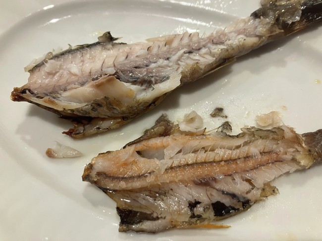 サンゴイワシの身(手前側)は、身の背と腹側と骨がオレンジ色がかっている。