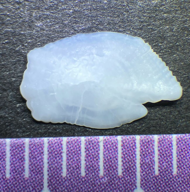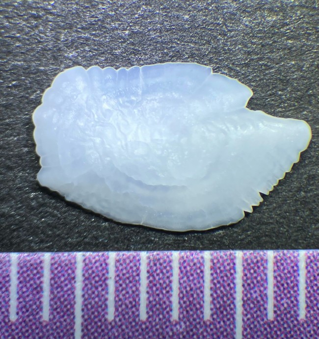 サンゴイワシの耳石は、体の大きさの割に大きい。形はちょっと太めの木の葉型。
