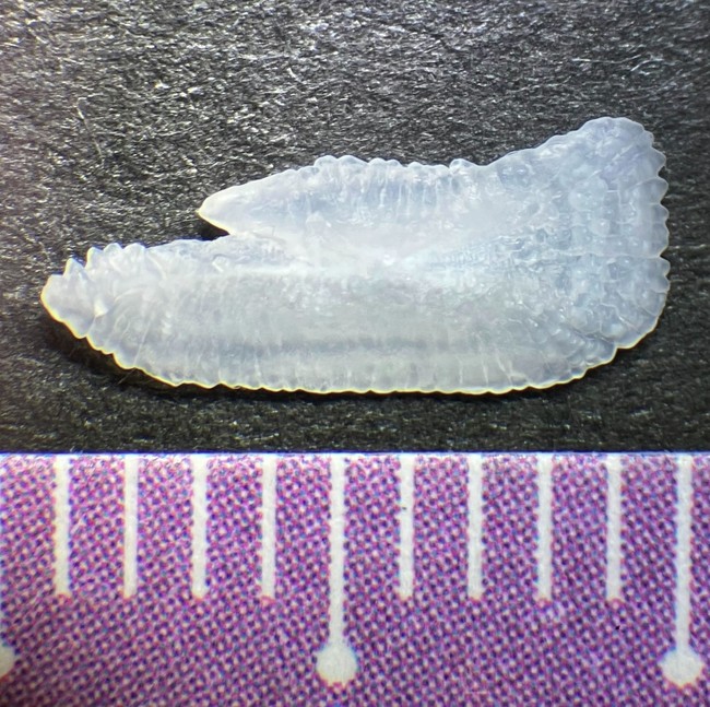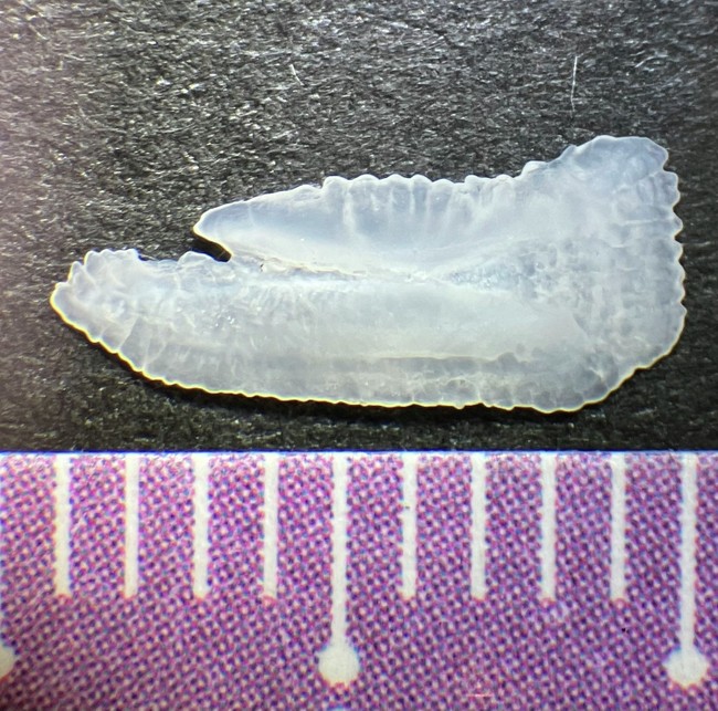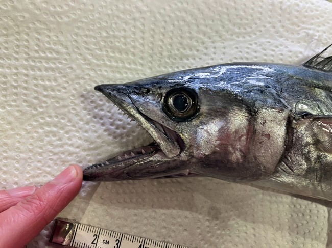 2023-02-27 サゴシのフライ サゴシ 長崎県産のサゴシ、498円を買う。 大きな口とギザギザの歯。 三枚におろしてフライにする。大きかったので、とても2人家族では食べられない量のフライが出来上がった。 1日目は揚げたてを、大根の葉の糠漬けとマヨネーズを混ぜたタルタルソースで食べる。 2日目はカツ丼風に。甘辛の煮汁で玉ねぎを煮、そこにフライを並べて卵とじに。 サゴシの耳石です。 魚も大きかったけど、耳石も大きい。