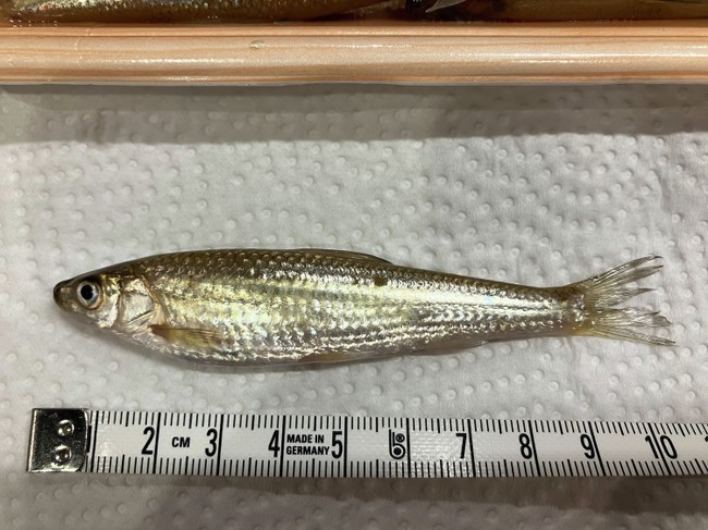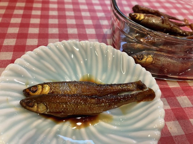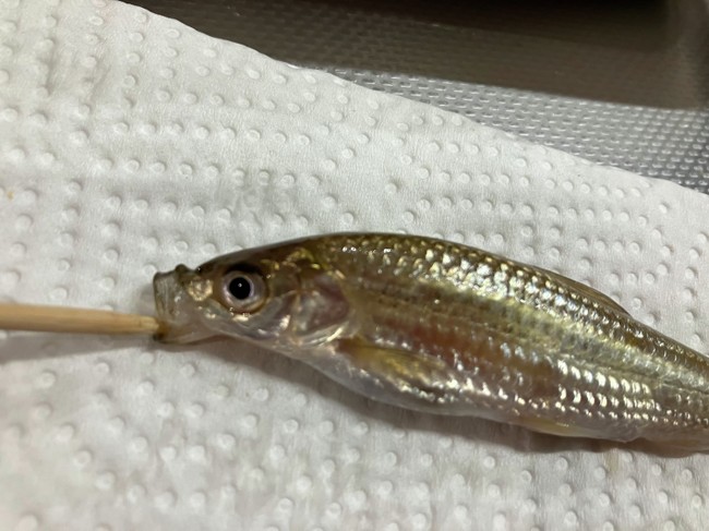 2023-04-14 ホンモロコの佃煮 ホンモロコ 琵琶湖産(滋賀県産)のホンモロコを買う。12尾入って303円。 鱗がテカテカしてて、口は大きく開きます。 佃煮にする。酒、砂糖、醤油、みりん、酢、水を煮立てたところに入れて、ペーパーで落し蓋をして、壊れないようにコトコトと煮る。 美味しく煮上がりました。子持ちで、腸のほんのりとした苦味がアクセントです。 ホンモロコの1㎜ほどの小さな耳石です。