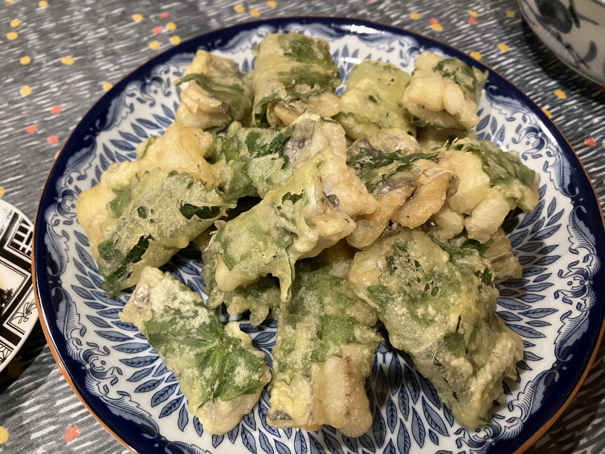 この青じそで、三枚におろして棒状に切ったタチウオを巻いて、