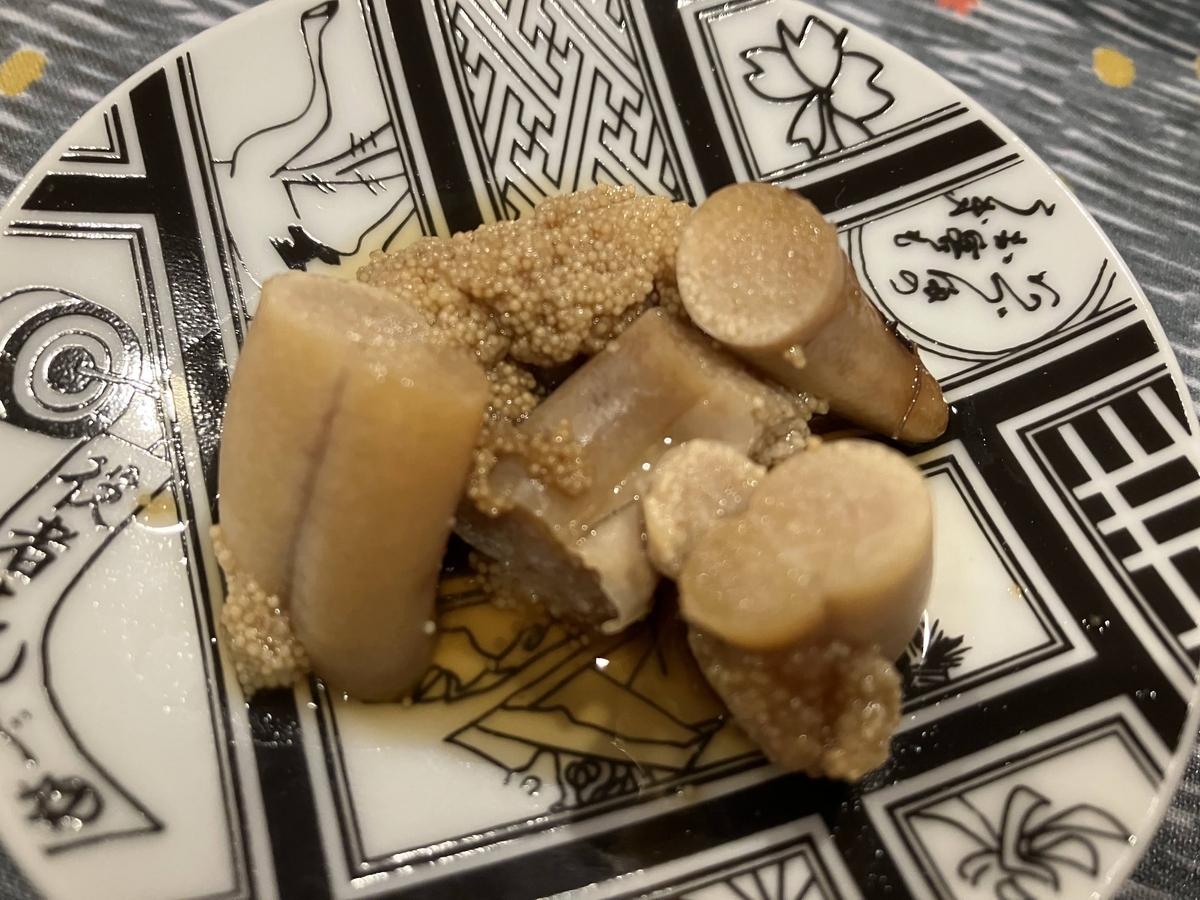 長いタチウオの、長い腹腔部に、長い卵が入っていたので、甘辛く炊いたら、しゅしゅしゅしゅっと長さが半分くらいに縮みました。ねっとり感があってオツな味。